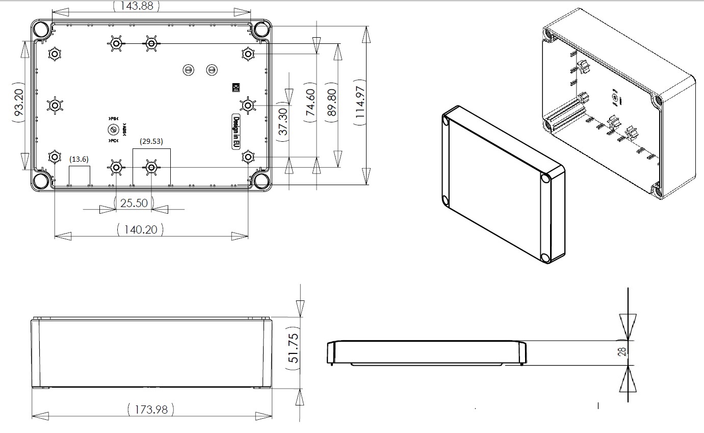 Grey ABS, IK08, IP66 junction box. Features clear lid, captive plastic screws, slots for vertical PCB mounting and supplied with a 35mm Din rail with fixing screws. RAL7035