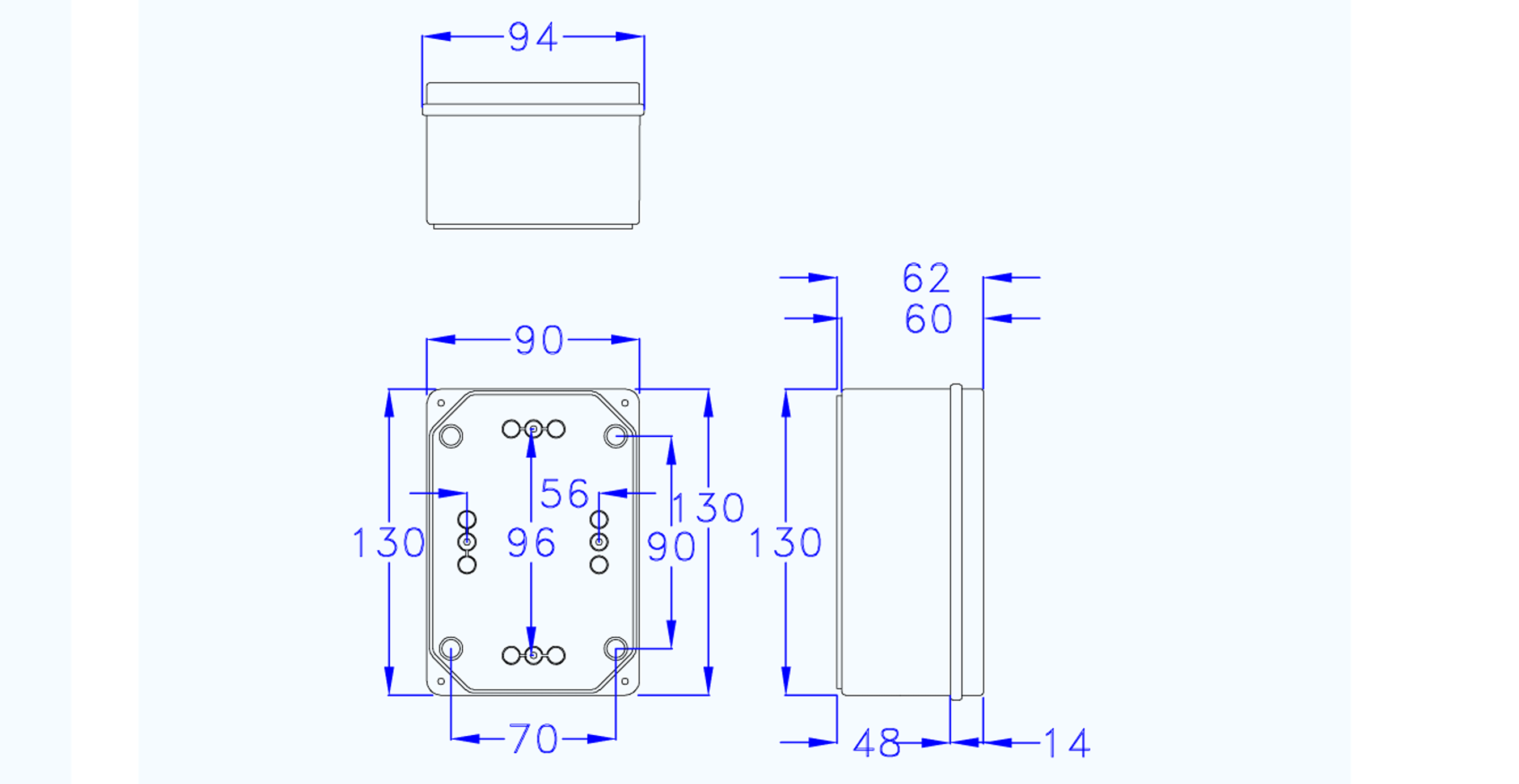 Internally there are mounting points for securing PCB or din rails and knockout points in the base for easy mounting.