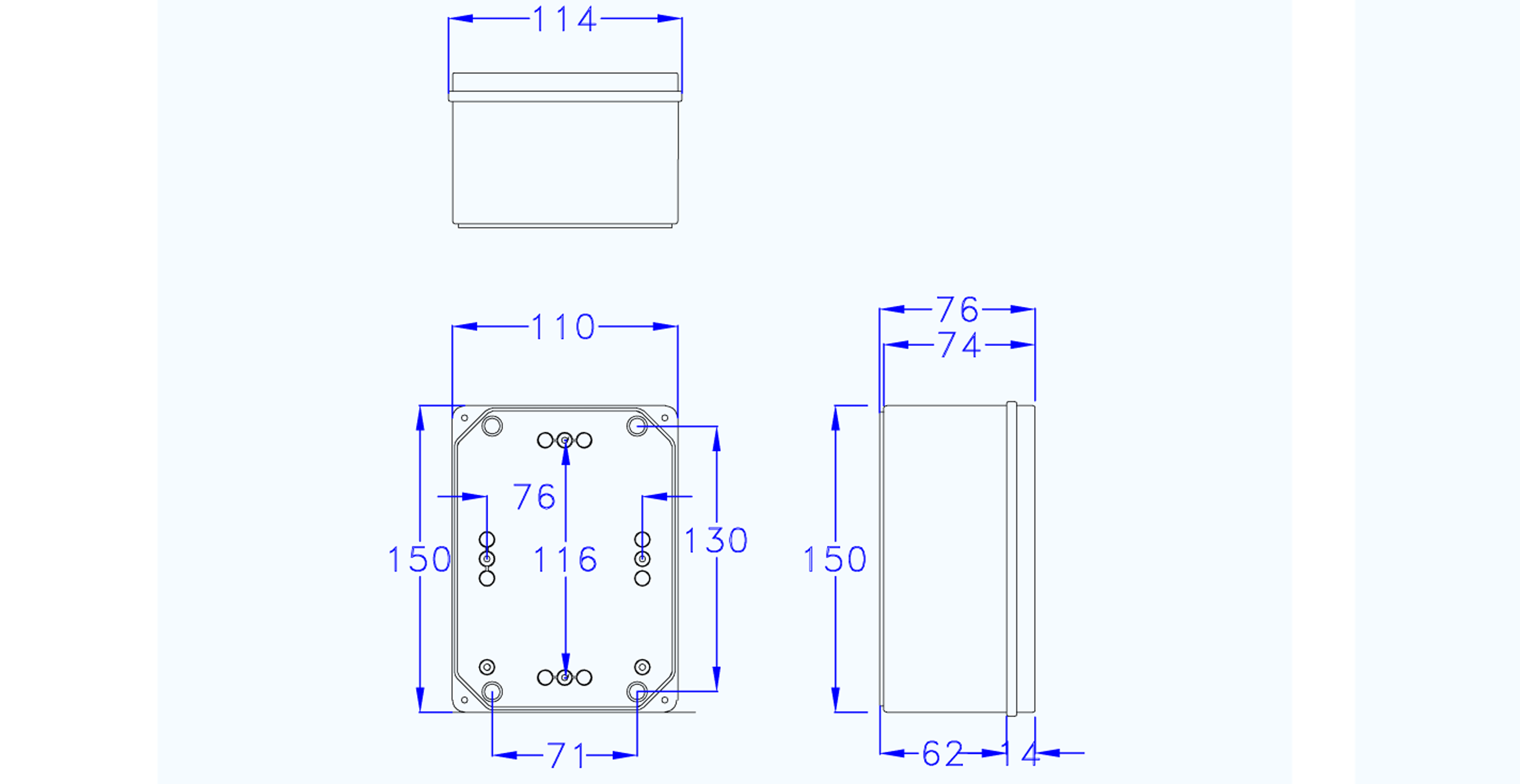 Internally there are mounting points for securing PCB or din rails and knockout points in the base for easy mounting.