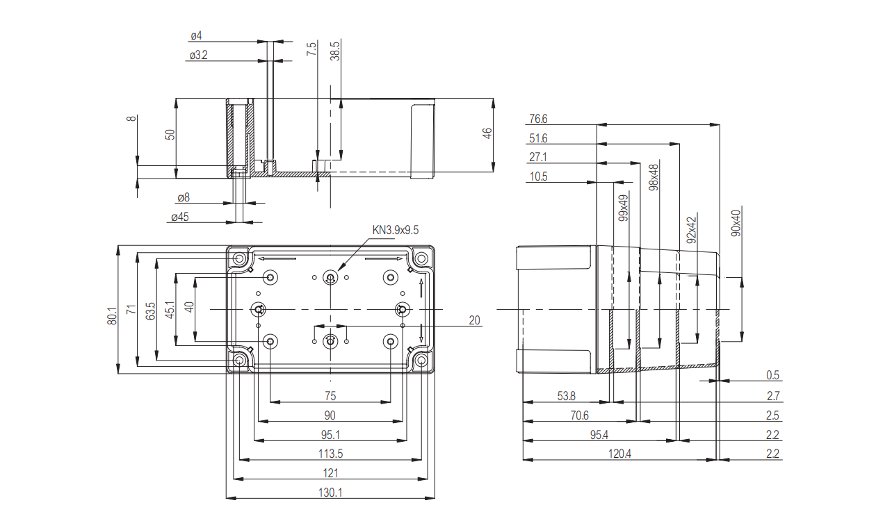 Rectangular, grey, RAL 7035, base 25mm, screw together, IP66/IP67 rated, internal PCB stand off’s, smooth finish, material Polycarbonate.