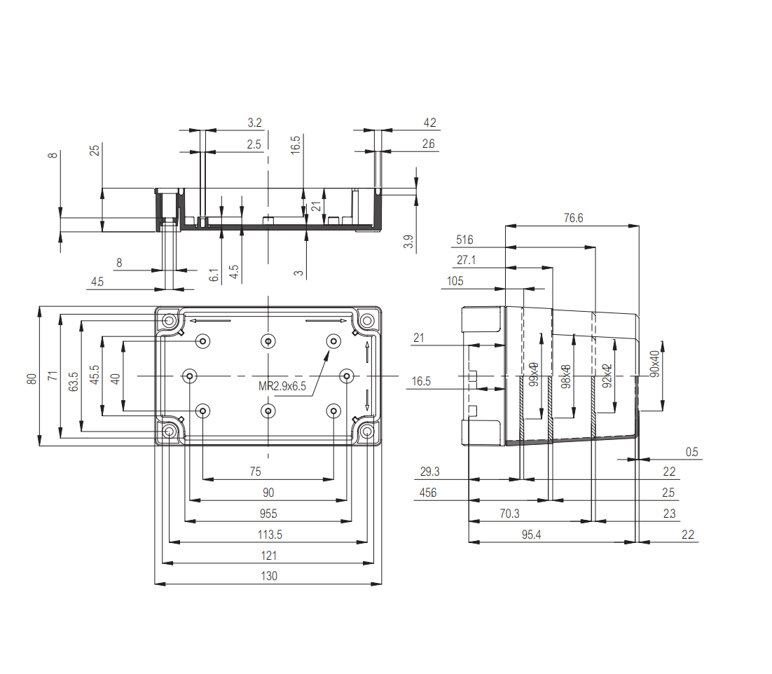 Rectangular, grey, RAL 7035, base 25mm, screw together, IP66/IP67 rated, internal PCB stand off’s, smooth finish, material Polycarbonate.