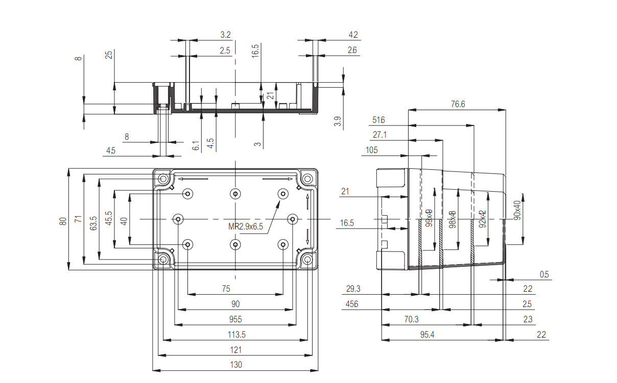 Rectangular, grey, RAL 7035, base 25mm, screw together, IP66/IP67 rated, internal PCB stand off’s, smooth finish, material Polycarbonate.