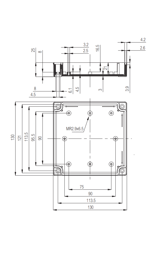 Rectangular, grey, RAL 7035, base 25mm, screw together, IP66/IP67 rated, internal PCB stand off’s, smooth finish, material Polycarbonate.