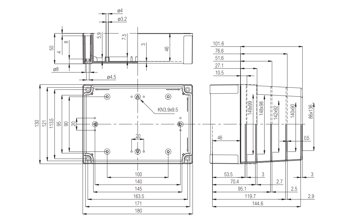 Rectangular, grey, RAL 7035, base 25mm, screw together, IP66/IP67 rated, internal PCB stand off’s, smooth finish, material Polycarbonate.