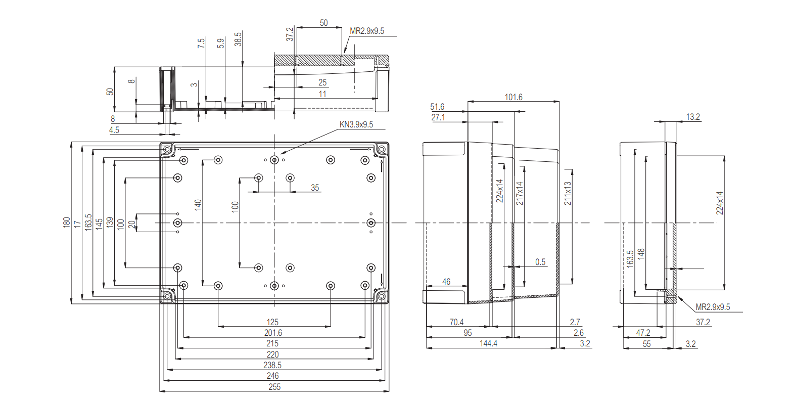 Rectangular, grey, RAL 7035, base 25mm, screw together, IP 67 rated, internal PCB stand off’s, smooth finish, material Polycarbonate, clear top, transparent cover.