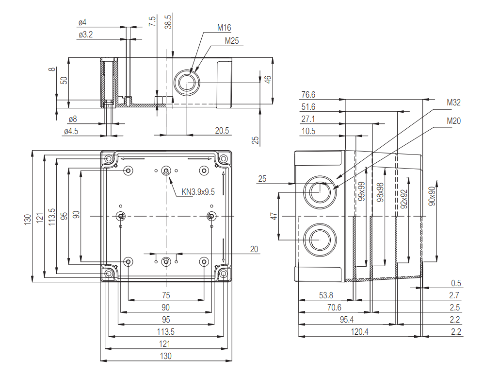 IP67 rated, light grey, smooth finish, cable gland knockouts, opaque grey cover, base height 50 mm, material polycarbonate, flame retardant v-2