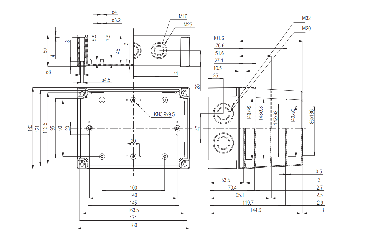 IP67 rated, light grey, smooth finish, cable gland knockouts, transparent/clear top cover, base height 50 mm, material polycarbonate, flame retardant v-2