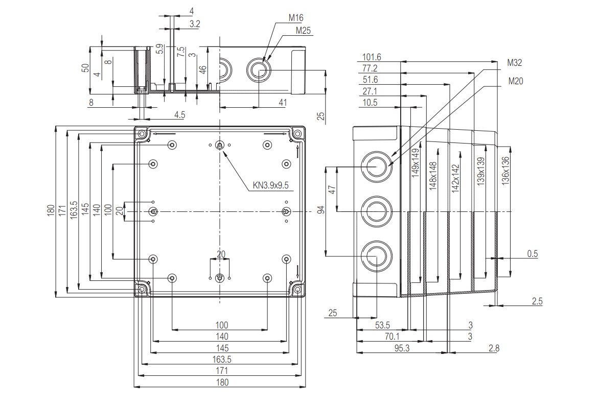 IP67 rated, light grey, smooth finish, cable gland knockouts, opaque grey cover, base height 50 mm, material polycarbonate, flame retardant v-2