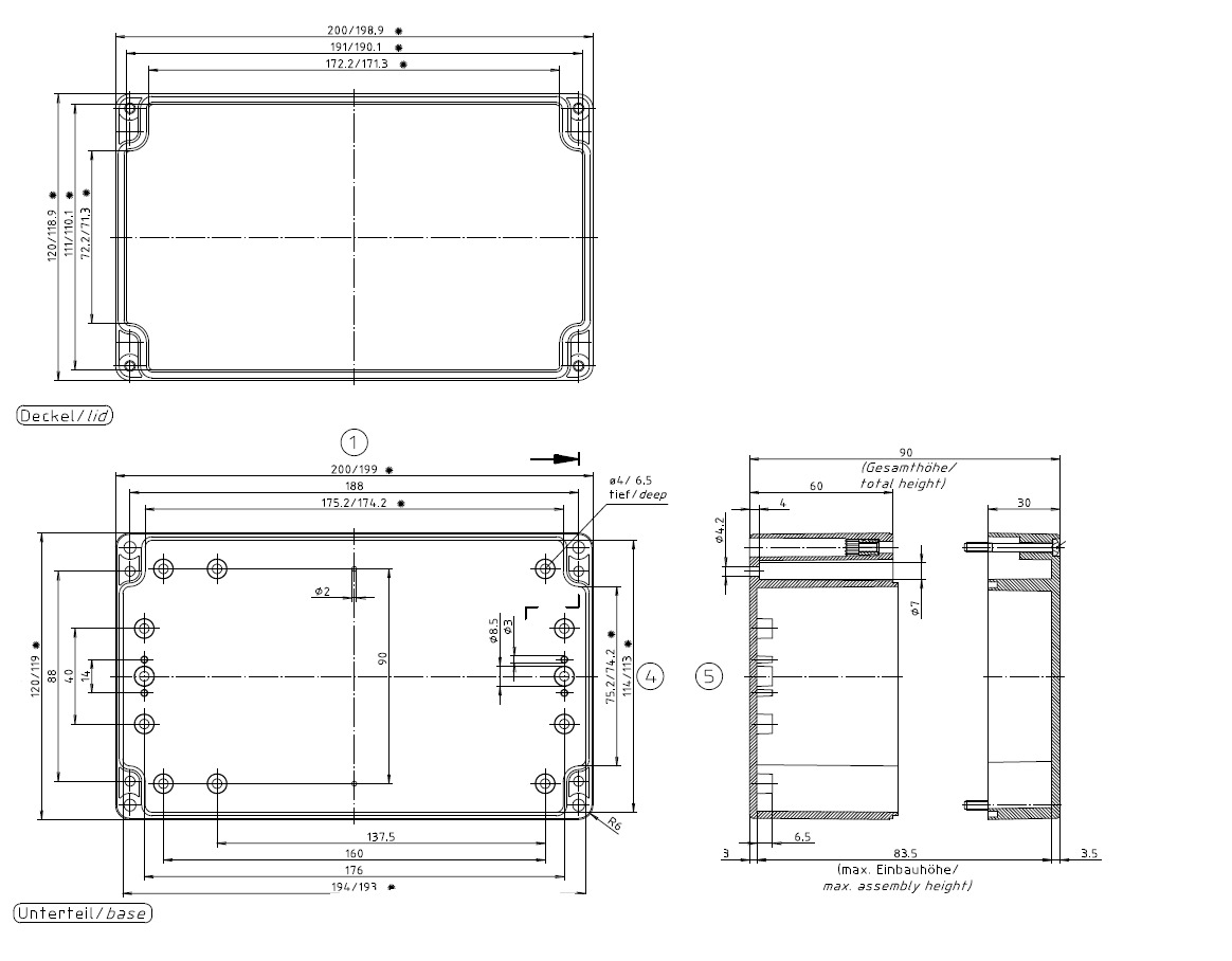 Internally there are mounting points designed to accommodate PCB, din rails and mounting plates. Wall mounting accessories are available to buy however there are existing mounting holes in the base of the enclosure that are situated outside of the sealed area and within the lid which allow for a concealed wall mounting option.