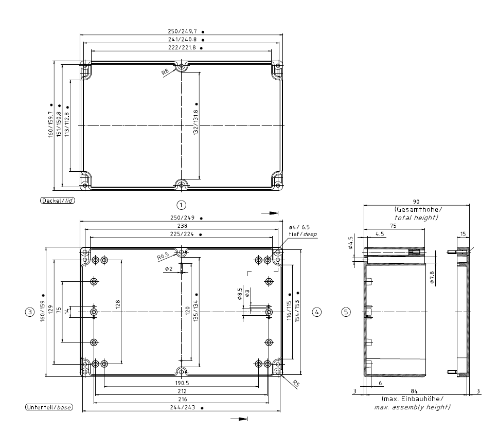 Internally there are mounting points designed to accommodate PCB, din rails and mounting plates. Wall mounting accessories are available to buy however there are existing mounting holes in the base of the enclosure that are situated outside of the sealed area and within the lid which allow for a concealed wall mounting option.