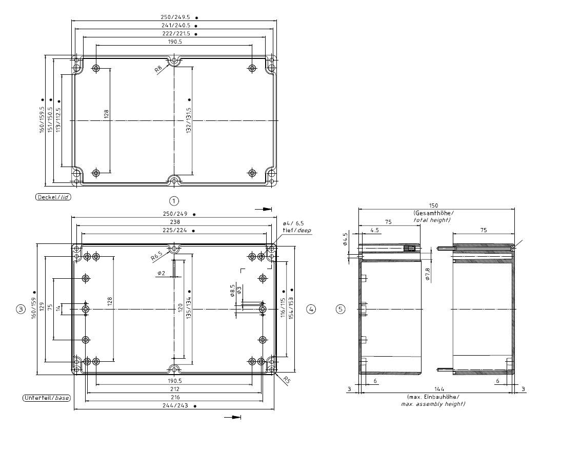 Internally there are mounting points designed to accommodate PCB, din rails and mounting plates. Wall mounting accessories are available to buy however there are existing mounting holes in the base of the enclosure that are situated outside of the sealed area and within the lid which allow for a concealed wall mounting option.