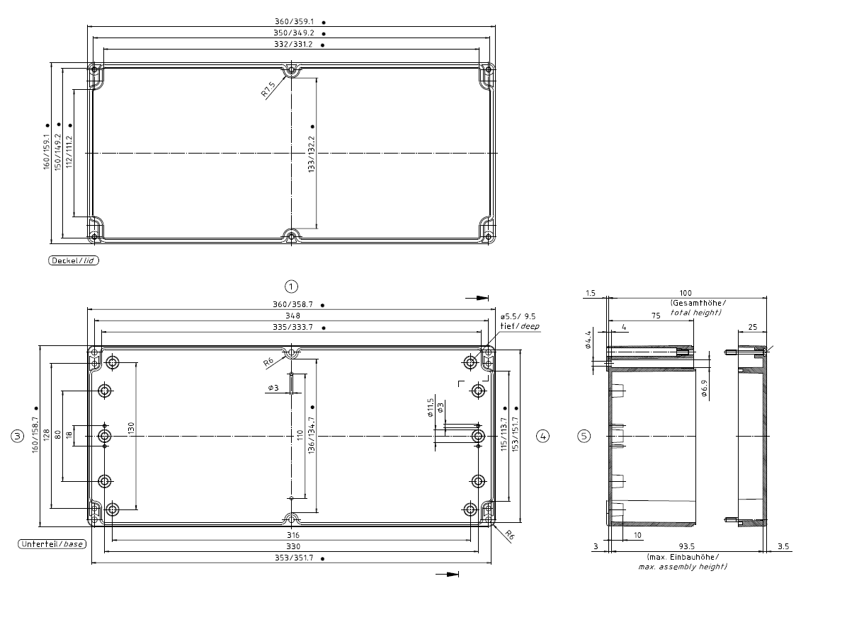 Internally there are mounting points designed to accommodate PCB, din rails and mounting plates. Wall mounting accessories are available to buy however there are existing mounting holes in the base of the enclosure that are situated outside of the sealed area and within the lid which allow for a concealed wall mounting option.