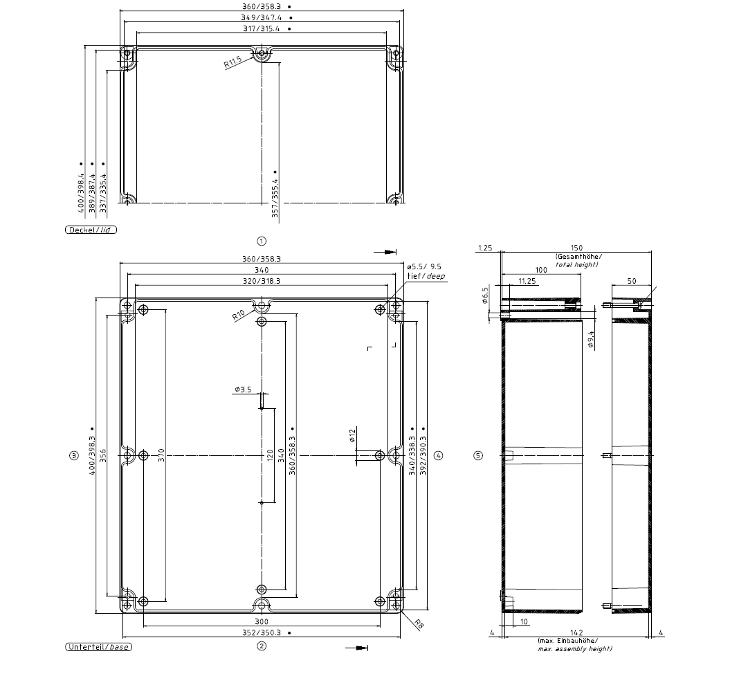 Internally there are mounting points designed to accommodate PCB, din rails and mounting plates. Wall mounting accessories are available to buy however there are existing mounting holes in the base of the enclosure that are situated outside of the sealed area and within the lid which allow for a concealed wall mounting option.