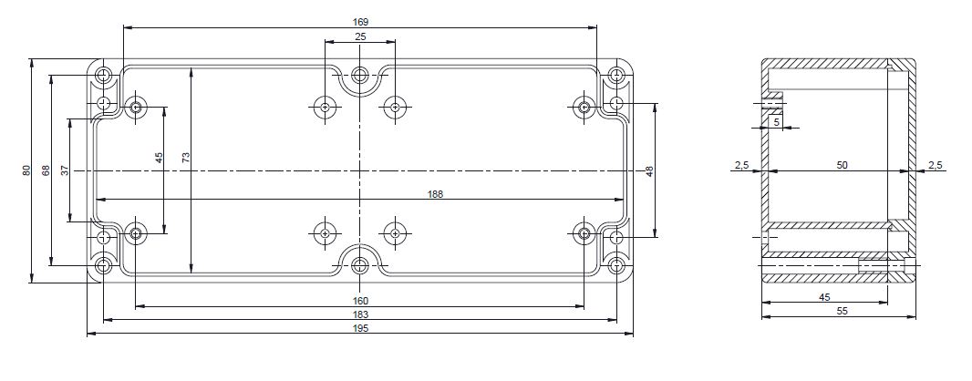 The EVA-234IPC is an IP67 rated junction enclosure. Base material ABS, lid material Polycarbonate.