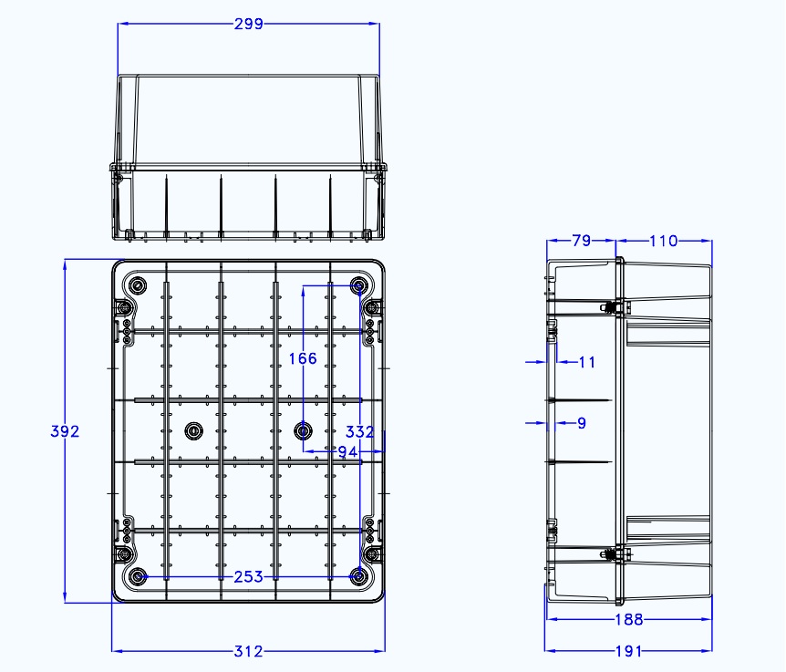 Internally there are mounting points for securing PCB and mounting plates as well as channels for mounting din rails.