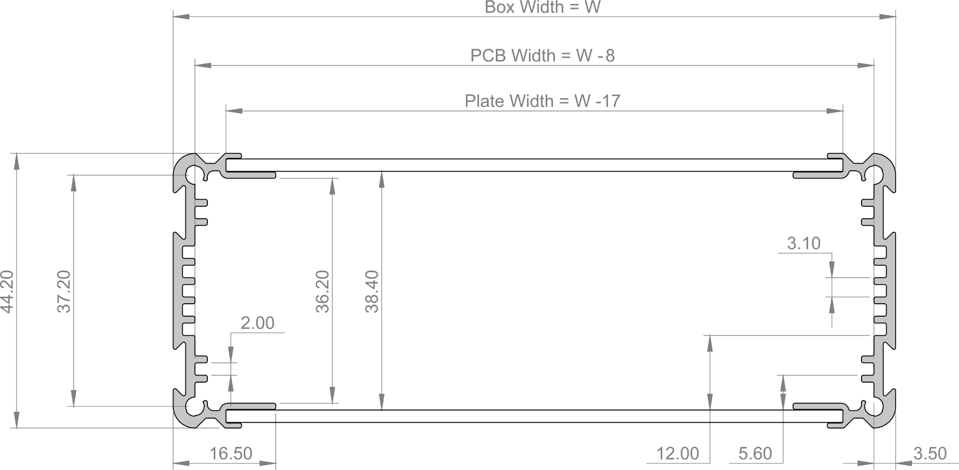 Available in set widths to suit 100mm, 128mm, 160mm and 220mm PCB’s. Overall case width is board width + 8mm.