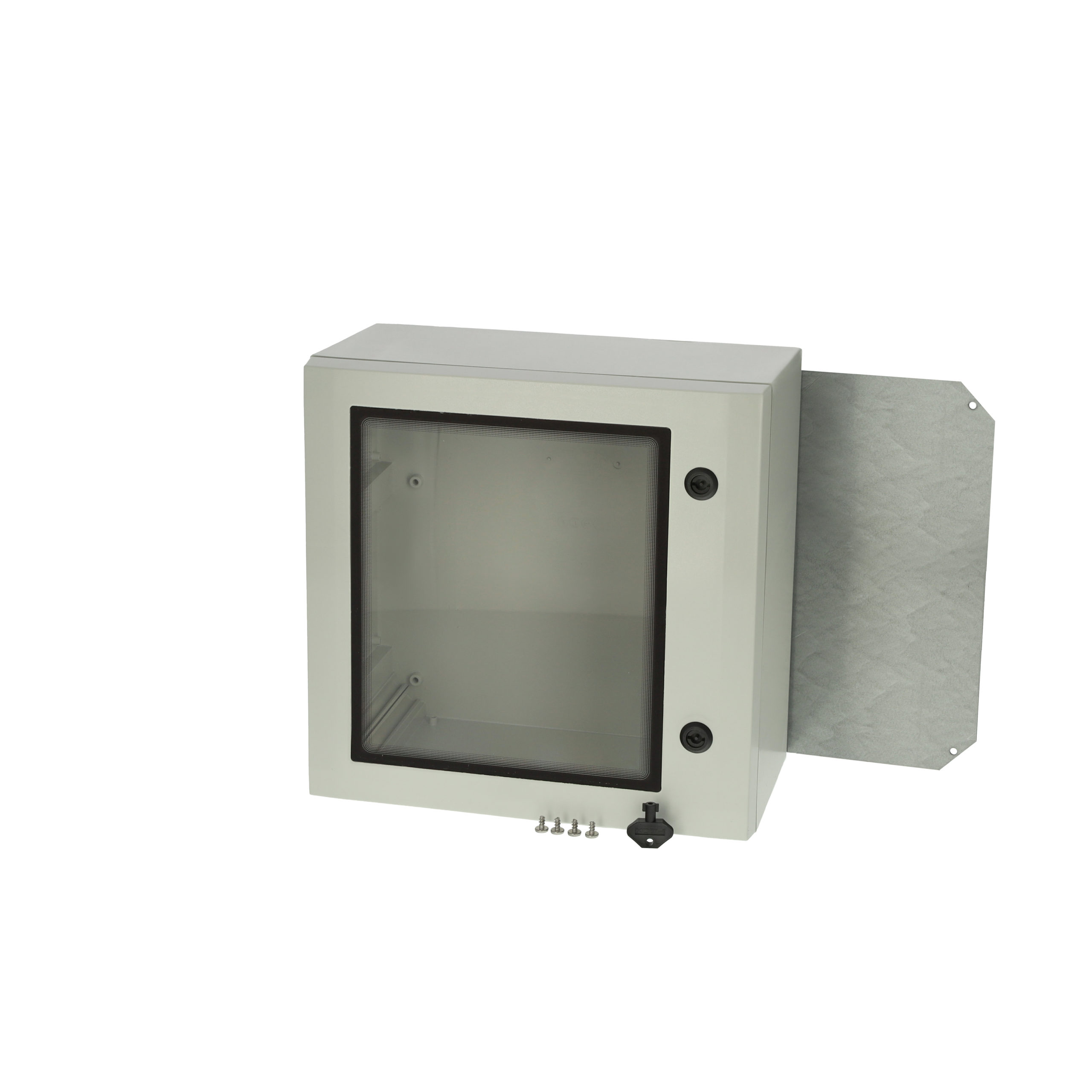 Grey (RAL 7035) polycarbonate IP66 cabinet enclosure with clear window, PUR gasket and back plate. Two point changeable locking system with key which is included in the case. ARCA cabinets are designed for harsh and demanding environments combining robust and rugged qualities with ease of use and installation. The polycarbonate material achieves IK10 impact rating and UL94-5VA flammability rating.