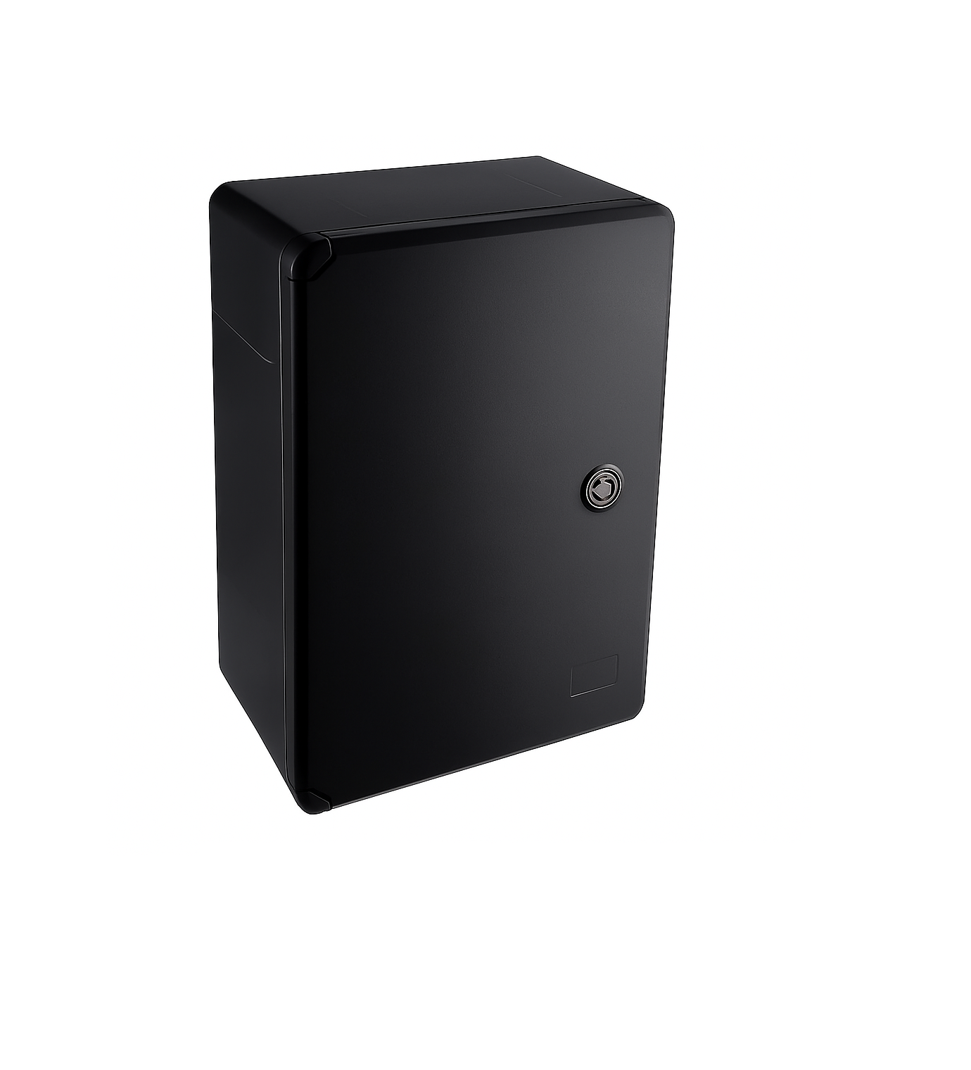 The EVADEB1 control cabinet enclosure is manufactured in black ABS HB flame retardant material. The enclosure is robust and designed to meet combustible standards IK10 and ingress protection IP65 thanks to the sealing gasket. The enclosure features 1 point locking with key and hinges are on the long side of the case. The ABS material is capable of withstanding temperatures -40 to +85C making the case ideal for use in sea salt air conditions and also dry dusty environments.