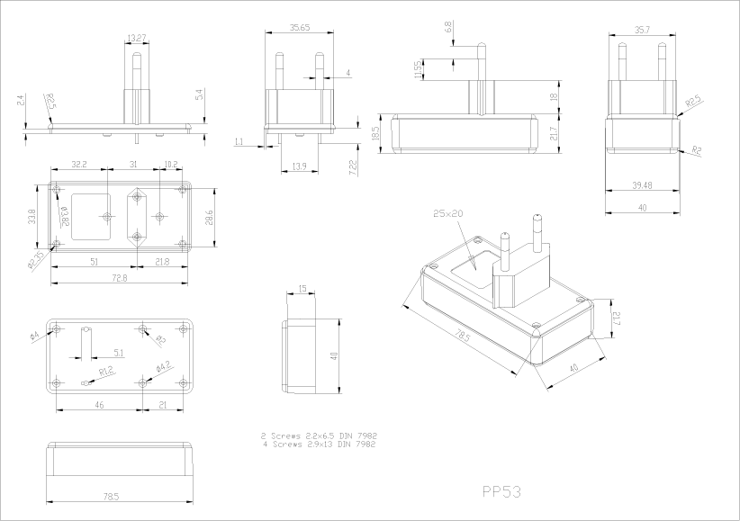 Euro 2 pin plug case, material ABS, black. Alternative larger versions PP54N and PP55N.LOW COST MACHINING.This product can be machined to your specifications at the point of manufacture.Contact us for details.