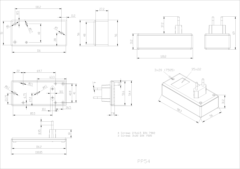 Euro 2 pin plug case, material ABS, black. Alternative larger version PP55N and smaller version PP53N.LOW COST MACHINING.This product can be machined to your specifications at the point of manufacture.Contact us for details.