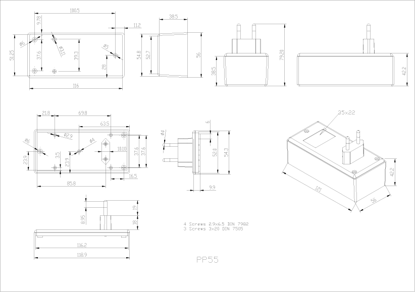 Euro 2 pin plug case, material ABS, black. Alternative smaller versions PP54N and PP53N.LOW COST MACHINING.This product can be machined to your specifications at the point of manufacture.Contact us for details.