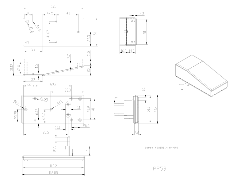 Euro 2 pin plug case, material ABS, black. Slopping. Alternative versions PP53N, PP54N and PP55N.LOW COST MACHINING.This product can be machined to your specifications at the point of manufacture.Contact us for details.