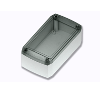Standard ABS, light grey with transparent PC lid, with recessed lid and base for membrane keypads. Modern aesthetics with square edges and rounded lateral sides, lid mounted by four M3 bolts, hidden by self-adapting rubber plugs.