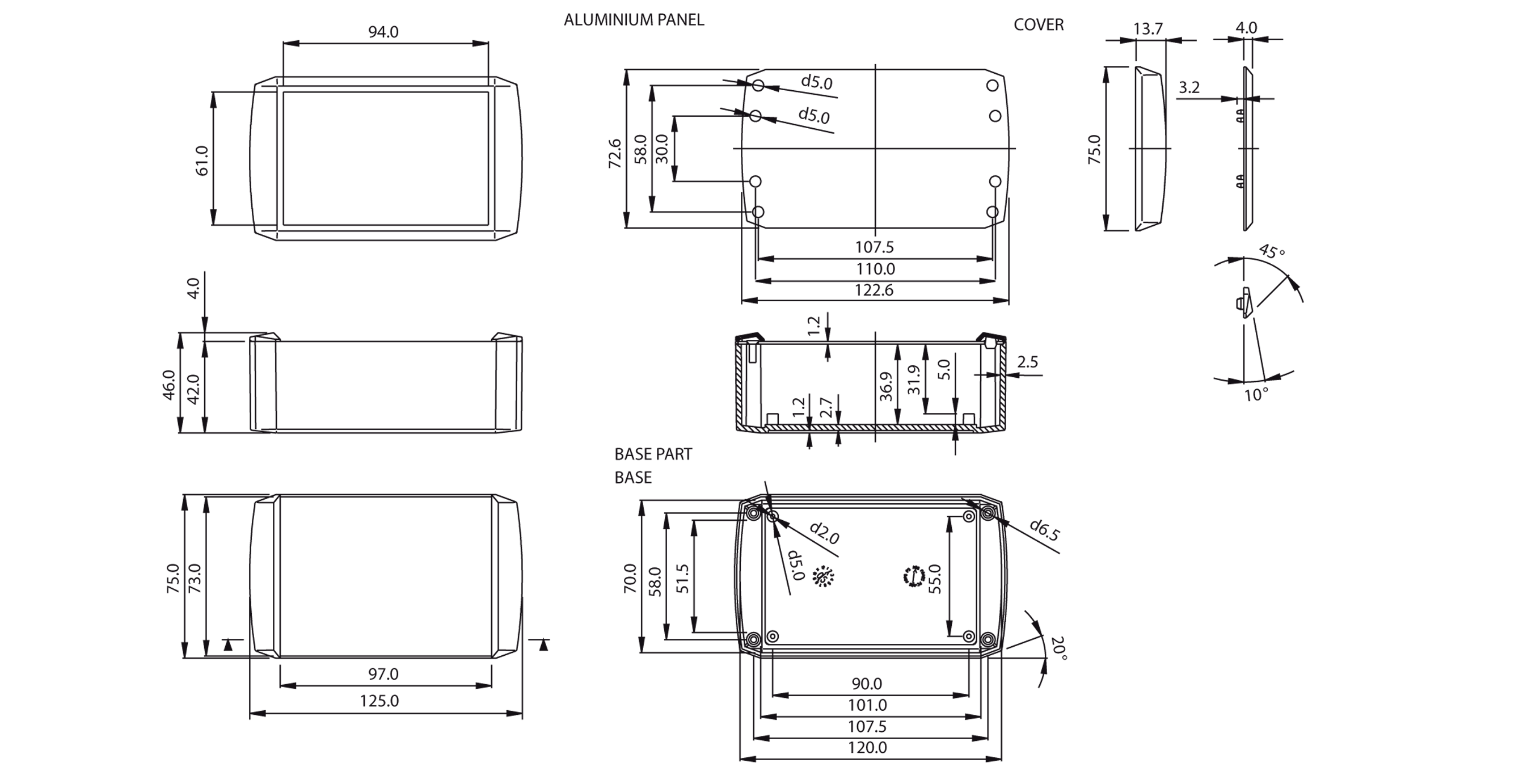 Standard ABS, light grey base and lid panel in 1mm aluminium silver anodised, with recessed base for membrane keypads. Modern aesthetics with square edges and rounded lateral sides, lid mounted by four M3 bolts, hidden by plastic covers.