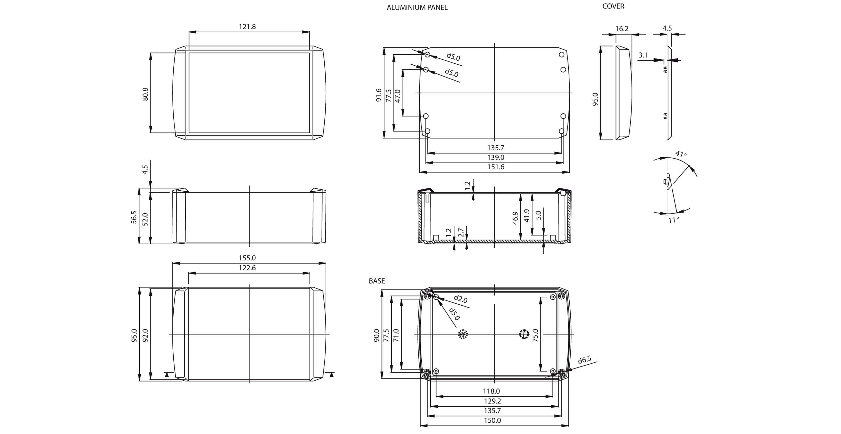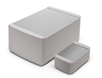 Standard ABS, light grey base and lid panel in 1mm aluminium silver anodised, with recessed base for membrane keypads. Modern aesthetics with square edges and rounded lateral sides, lid mounted by four M3 bolts, hidden by plastic covers.