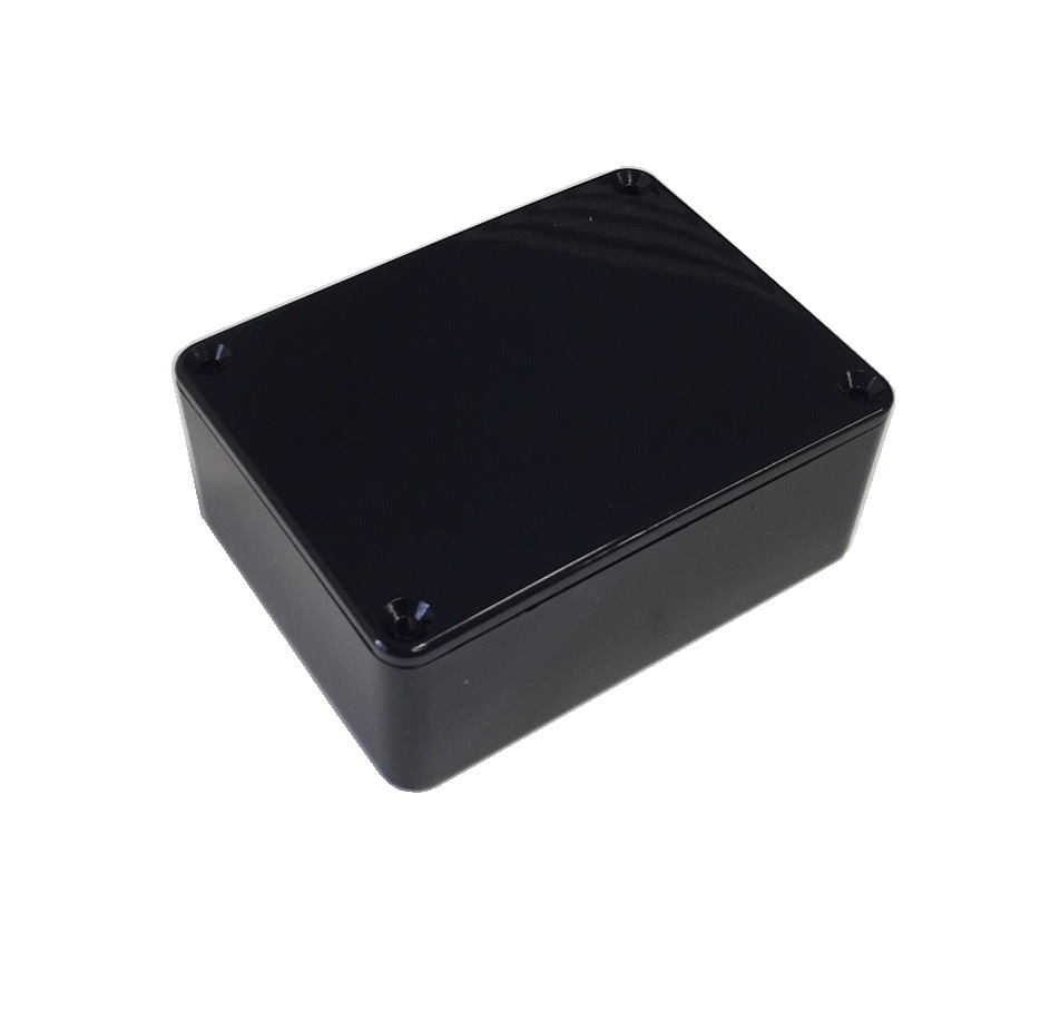 Small rectangular, material ABS, screw together, smooth finish, vertical PCB guides, colours black, white or grey