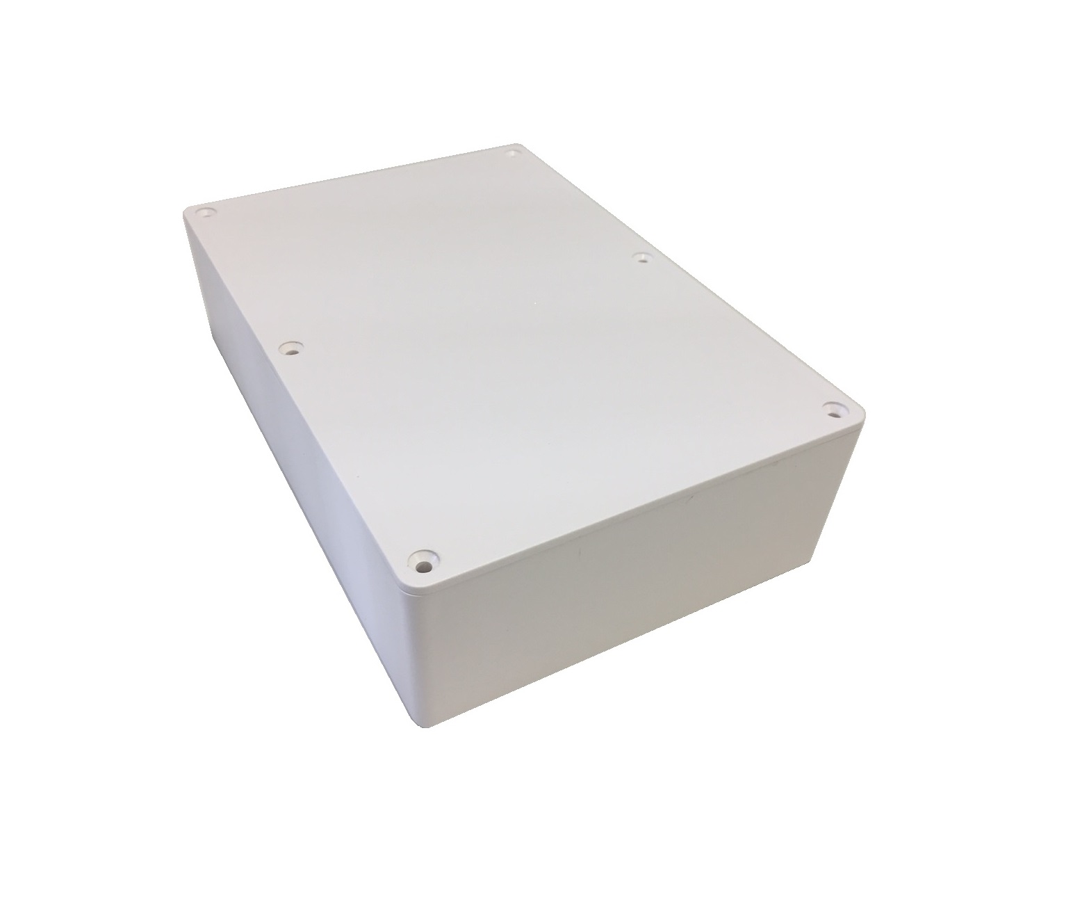 Large rectangular, material ABS, screw together , smooth finish, vertical PCB guides, colours black, white or grey
