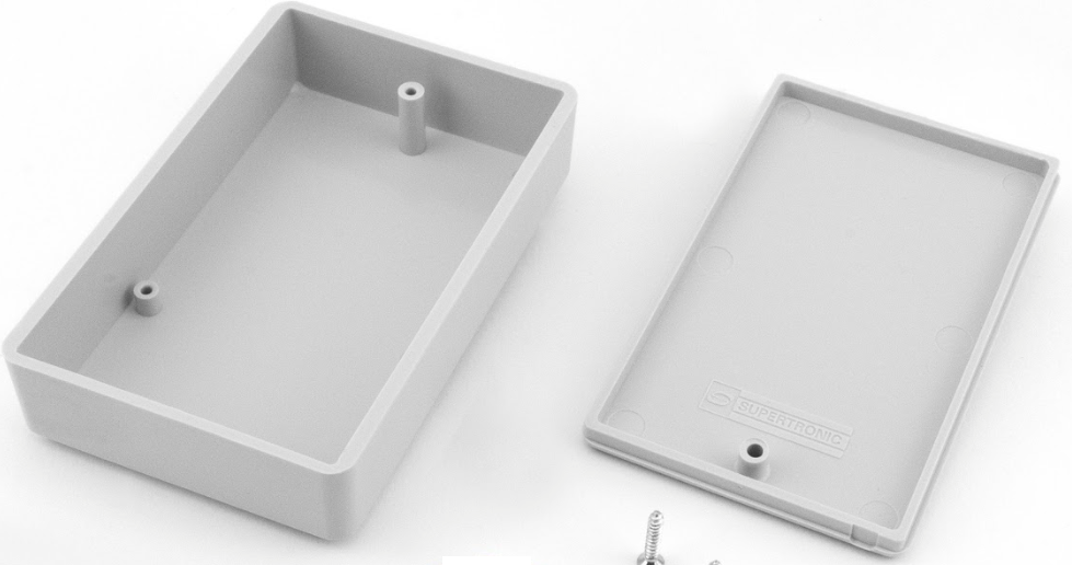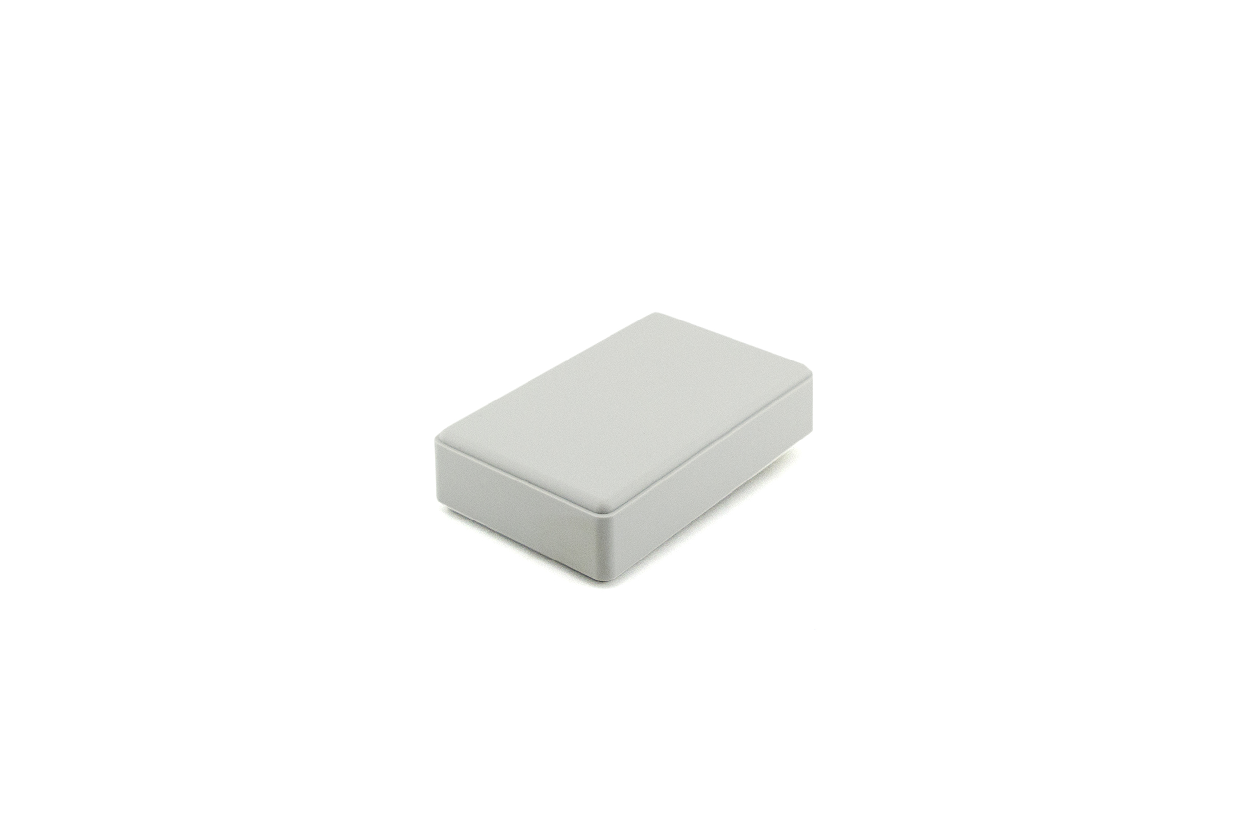 Small Rectangular, smooth top, with PCB mounts, screw together, grey, material ABS.