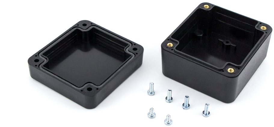 Black ABS enclosure, waterproof to IP65, internal mounting pillars for PCB, all fixings supplied.