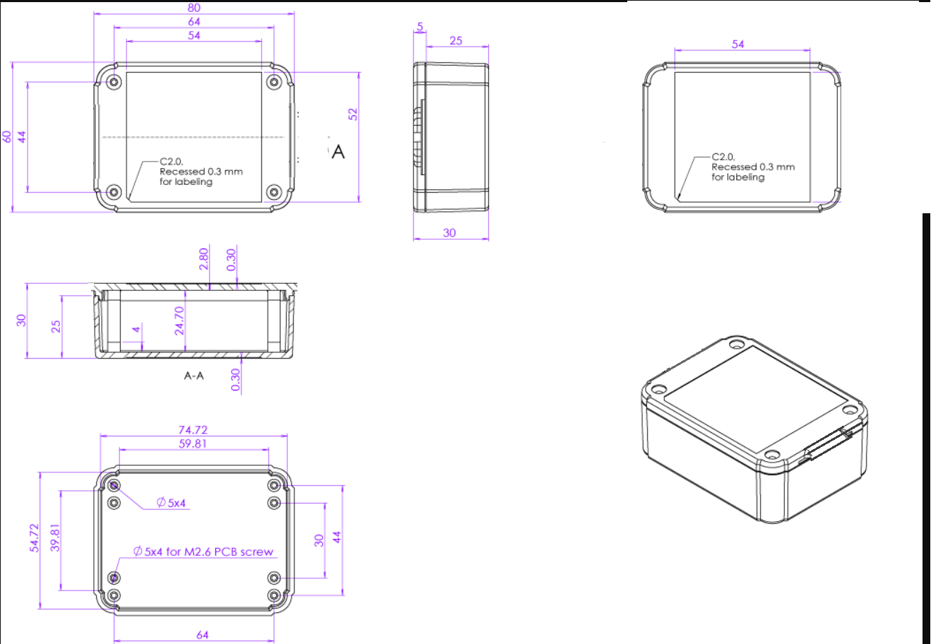Multipurpose enclosure moulded in grey ABS HB material. Internal PCB mounts in both the top and the base. Top and bottom recessed areas. All fixings supplied. Also available with flanged lid.