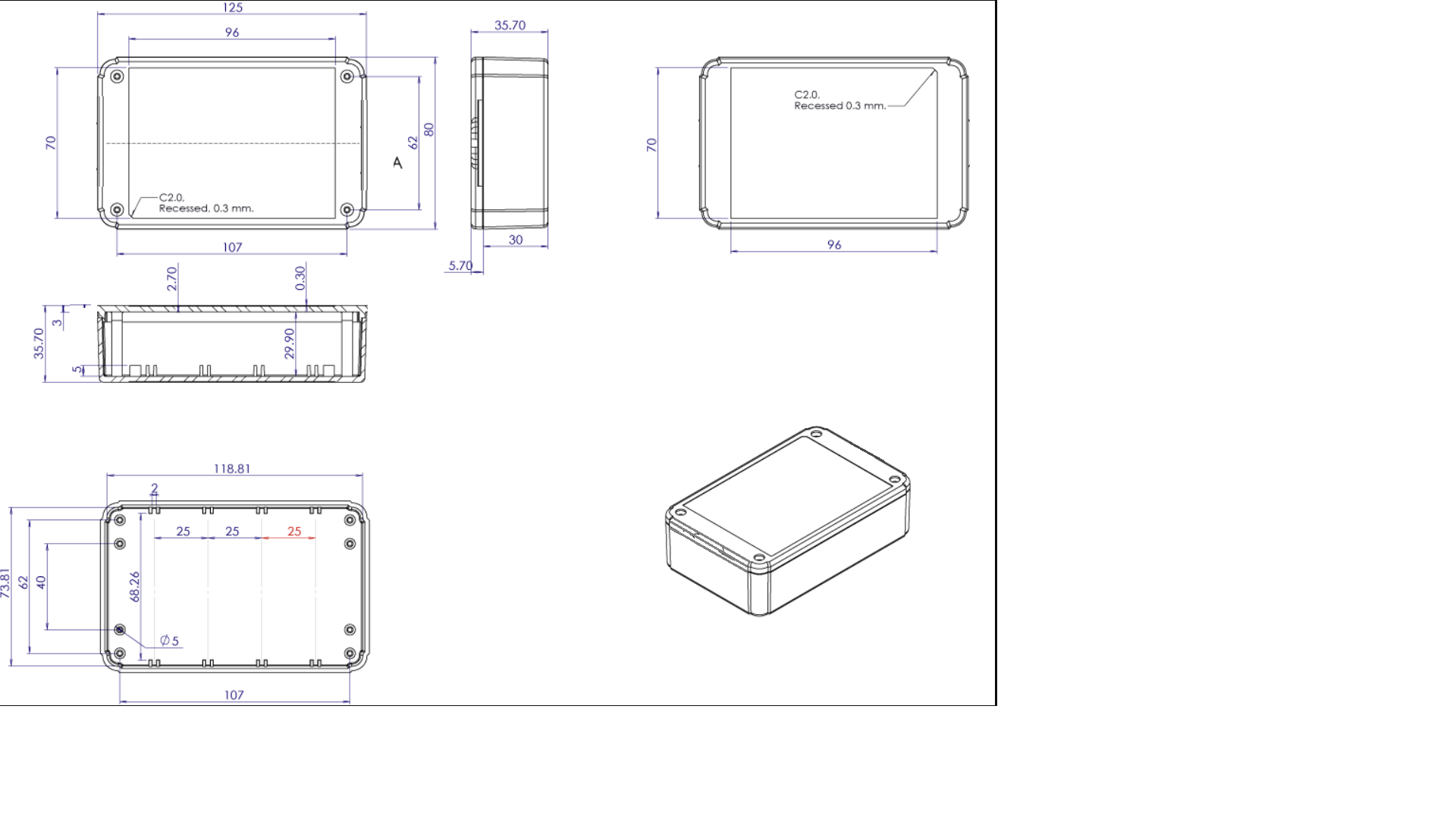Multipurpose enclosure moulded in grey ABS HB material. Internal PCB mounts in both the top and the base. Top and bottom recessed areas. All fixings supplied. Also available with flanged lid.